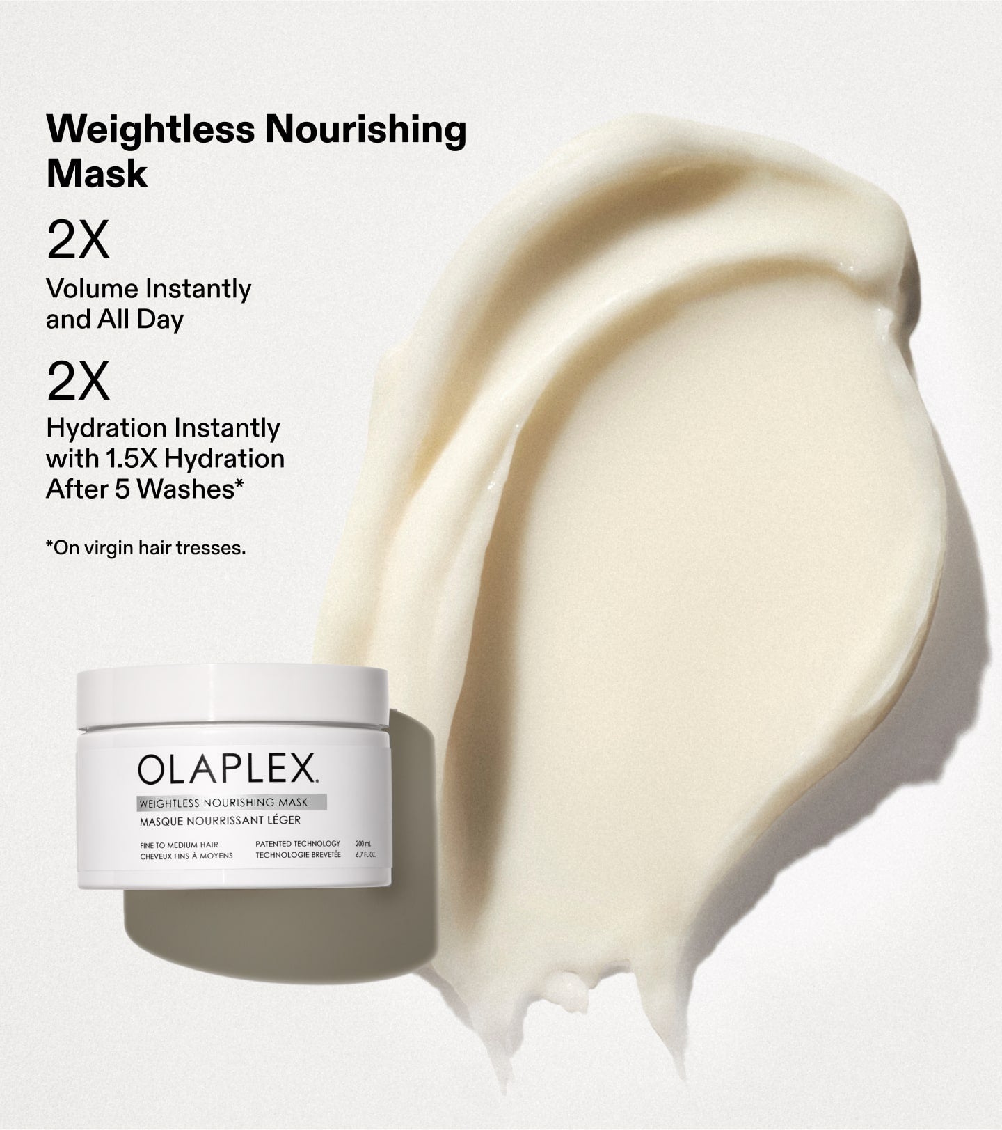 Los resultados pueden variar. Resultados obtenidos tras lavar el cabello con el N°.4FINE, aplicar la Weightless Nourishing Mask y peinar con el N°.6 y el OLAPLEX N°.7.